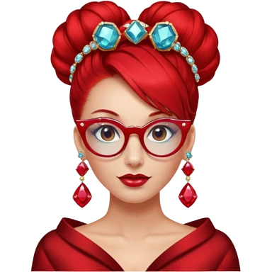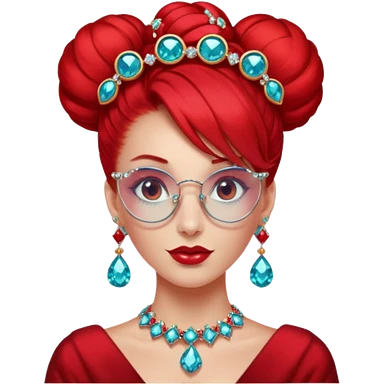gem lover woman with gem accessories excessive amount gem glassess very big gem earrings red bun hair and red diamonds emoji