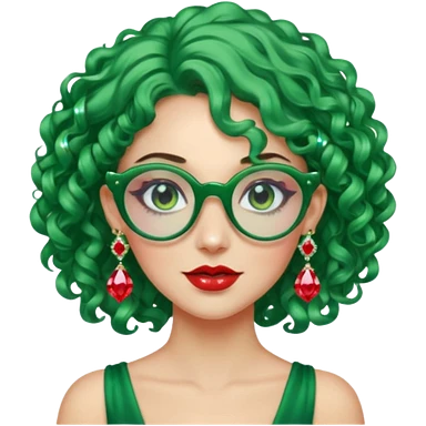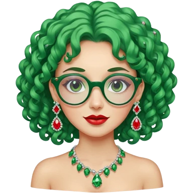 gem lover woman with gem accessories excessive amount gem glassess very big gem earrings green curly hair and red diamonds emoji