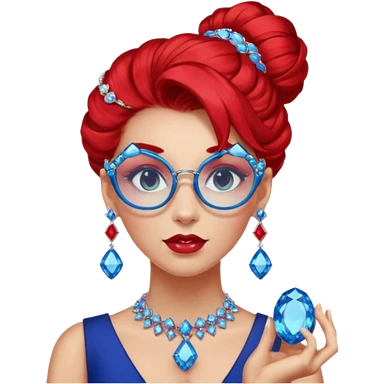 gem lover woman with gem accessories excessive amount gem glassess very big gem earrings red bun hair and redbluediamonds emoji