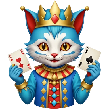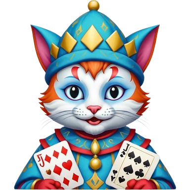 crazy colorful cute little cat jolly joker from poker, medieval, vintage, court jester, mac os icon, blue color, holds poker cards (clearly detailed and precise) emoji