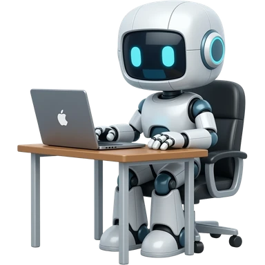 Genera un personaje de ROBIOX de cuerpo completo sentado en un escritorio con una laptop emoji