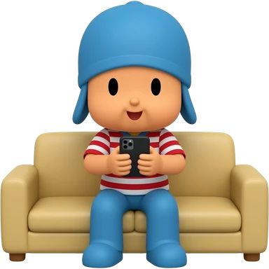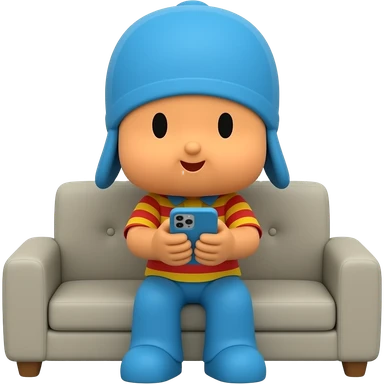 Genera un personaje de POCOYO con playera de rayas y jugando con su celular sentado en un sillon emoji