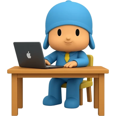 Genera un personaje de POCOYO de cuerpo completo sentado en un escritorio con una laptop emoji