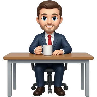 Genera un personaje de r de cuerpo completo sentado en un escritorio con una emoji