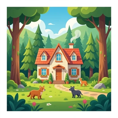 Hazme una casa grande donde viven unas 8 cabras dentro de la casa. La casa esta por en medio del bosque. Una casa acojedora y bonita ,que el bosque este llendo de animales bonitos i mucha natrualeza que toque un bastante los rayos de sol emoji