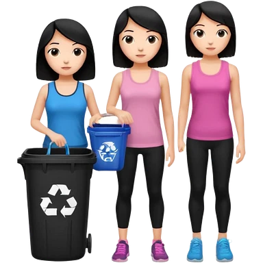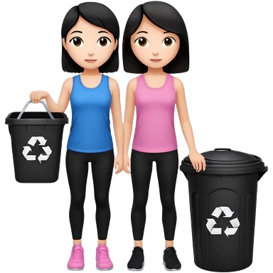 generate a genmoji of a black haired girl in a pink tank top and black leggings holding a black trash bag. Standing with her is a brunette girl in a similar blue tank top and black leggings.