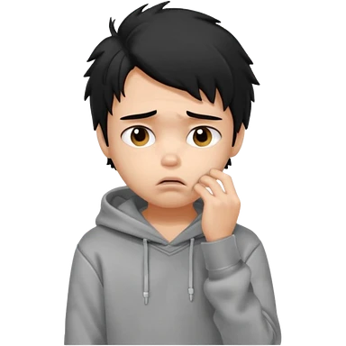 generate a pretty bratz fair skinned boy with messy black hair in a grey hoodie looking sad and bored with hand on chin emoji