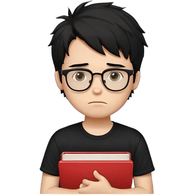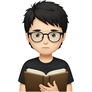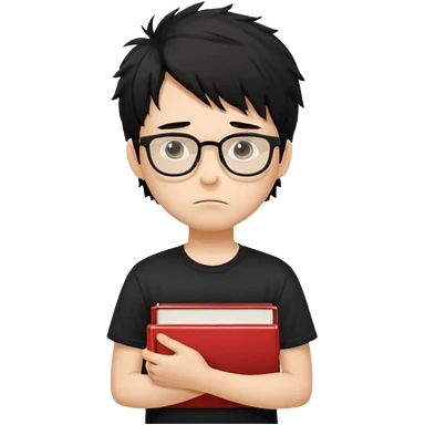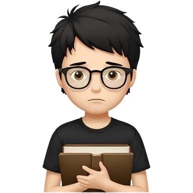generate a pretty bratz fair skinned boy with black messy hair wearing a black tshirt looking bored n tired. Glasses on. holding books emoji