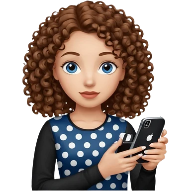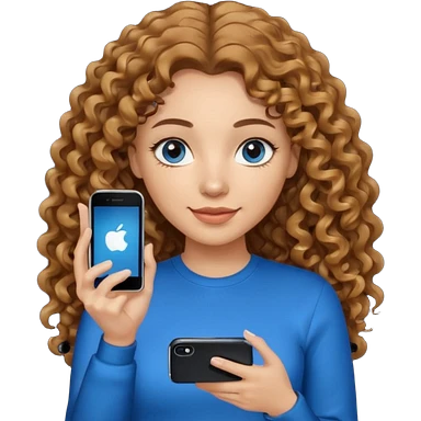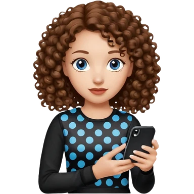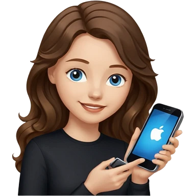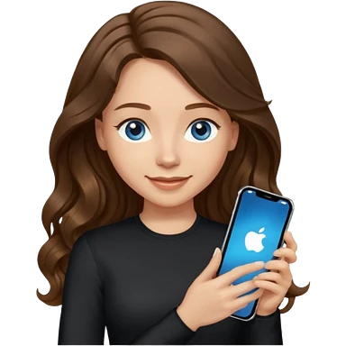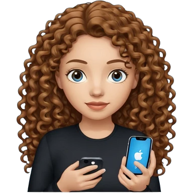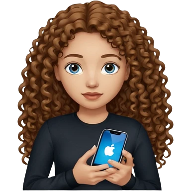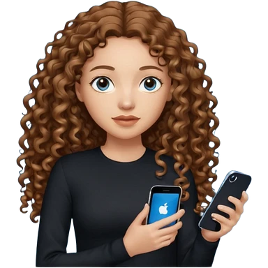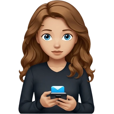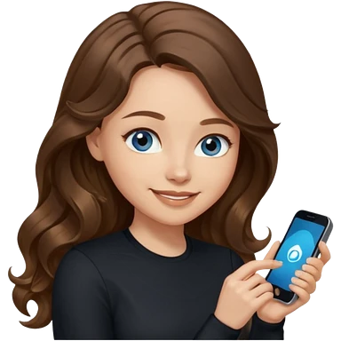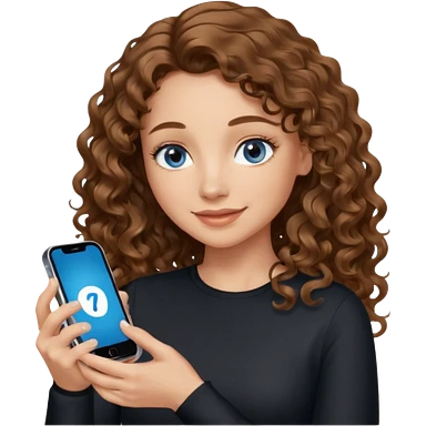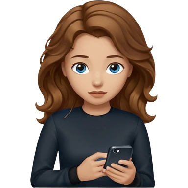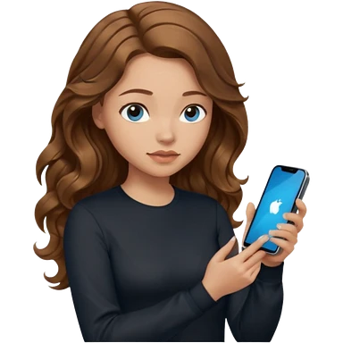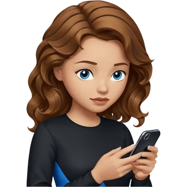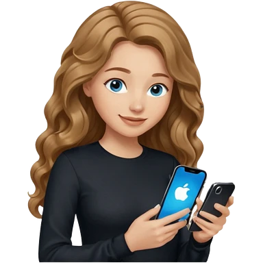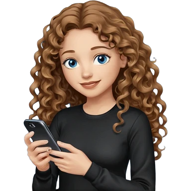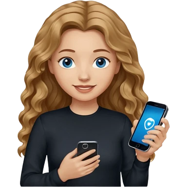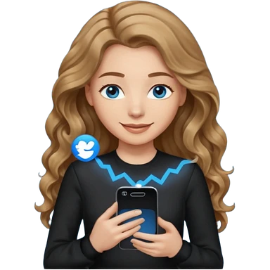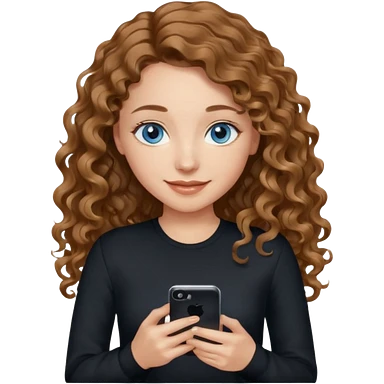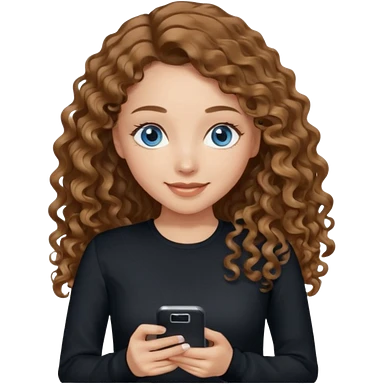 generate a pretty woman with blue eyes, light skin and long and really wavy shiny medium brown hair holding a phone while looking down at the screen. she is wearing an ALL black long sleeve. she is smiling emoji | AI Emoji Generator