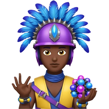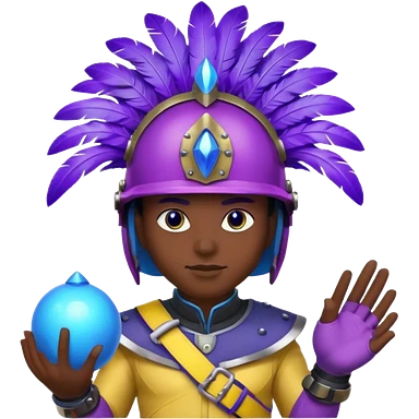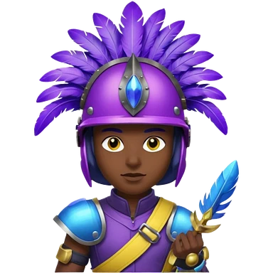 Generate an image of a night with a blue rounded feather on his helmet. He has a big night with balls as hands which have purple obsidian spikes on them. He also has a blue belt with yellow spikes on it. He also has purple glowing eyes. emoji | AI Emoji Generator