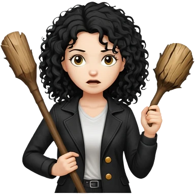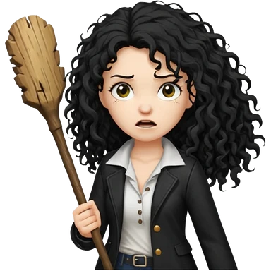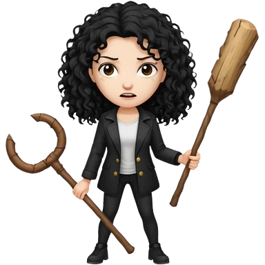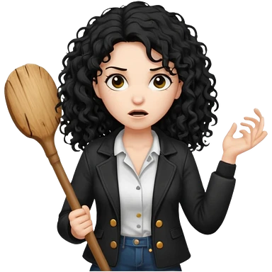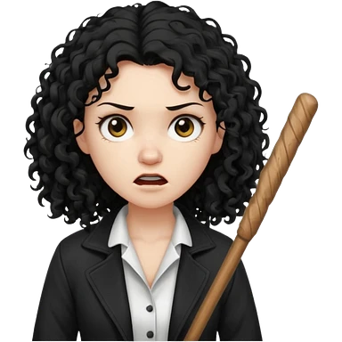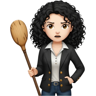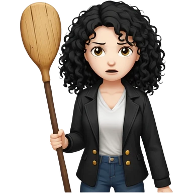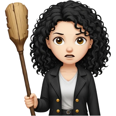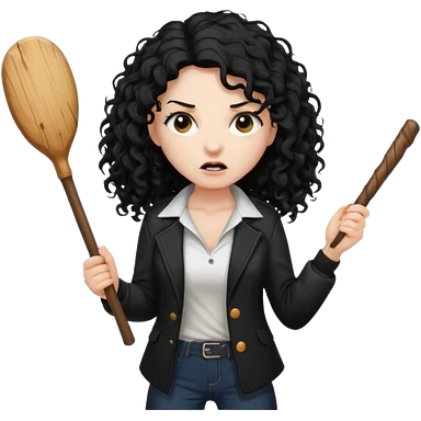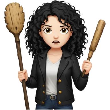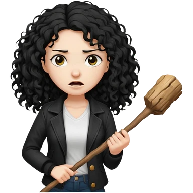 Hey, please generate me an emoji that depicts a woman white skin long black curly disheveled hair slightly thicker, she is wearing a white T-shirt and a black unbuttoned jacket she is furious she is holding a large wodden STICK emoji