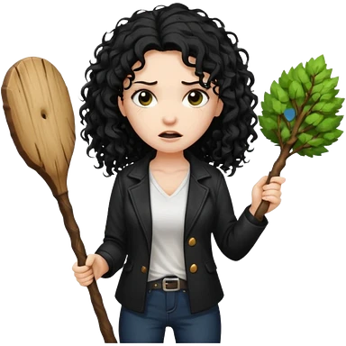Hey, please generate me an emoji that depicts a woman white skin long black curly disheveled hair slightly thicker, she is wearing a white T-shirt and a black unbuttoned jacket she is furious she is holding a large wooden stick from a tree in her hands emoji