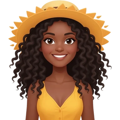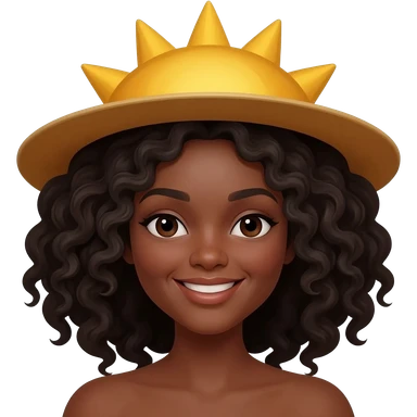 Génère un emoji avec un chapeau en forme de soleil et souriant. Une femme noir au cheveux crépu. En mode dessin animée emoji
