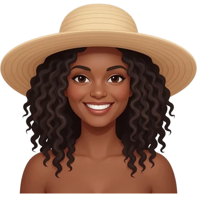 Génère un émoji avec un chapeau en forme de soleil et souriant. Une femme noir au cheveux crépu emoji