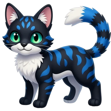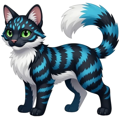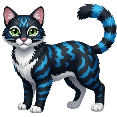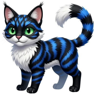 Colorful dark tropical gradient-colored cobalt-blue, black, white fur, with green eyes, iridescent glorious divine exotic cute cool beautiful shiny fantasy-caracal-civet-genet-sergal-vernid-Cacomistle-Furret-civet-oncilla-animal-Fakémon-hybrid-fursona with pattern markings (full body) emoji