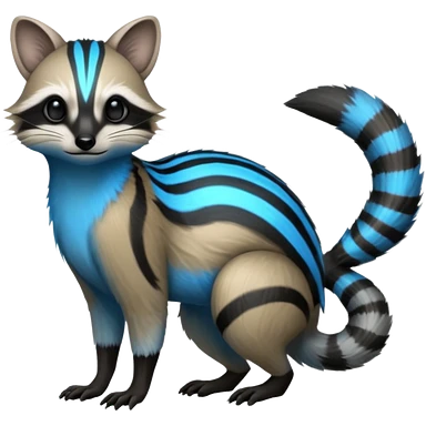 White and blue and grey and black neon glowing bioluminescent Genet-Numbat-Cacomistl-Tamarin-Tanuki-fusion-hybrid (full body) emoji