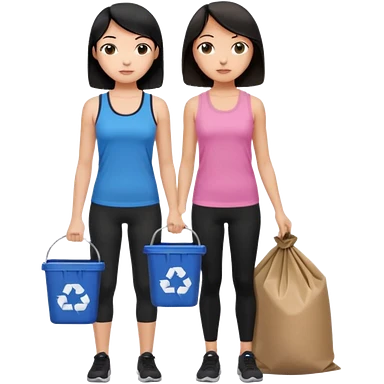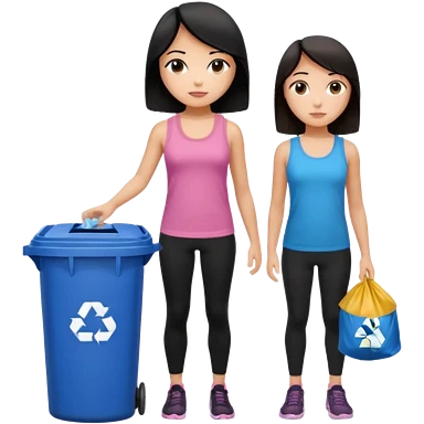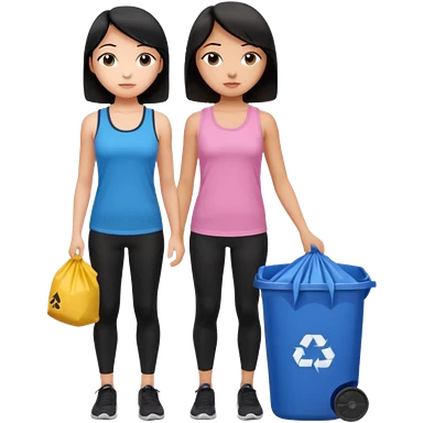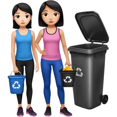 generate a genmoji of a black haired girl in a pink tank top and black leggings holding a black trash bag. Standing with her is a brunette girl in a similar blue tank top and black leggings. Standing in front of a dustbin emoji