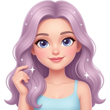 Animated Discord emoji, chibi-style girl with long flowing hair, soft pastel color palette. She gently strokes her hair with a confident, relaxed, slightly sassy expression. Large glossy eyes, soft shading, clean bold outline, highly expressive face. Subtle sparkles twinkle around her. emoji