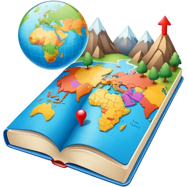 an icon featuring a globe with latitude and longitude lines, a textbook, and a topographic map, symbolizing geography as a science. The design includes a compass, mountain ranges, and rivers, representing the study of Earth's features and landscapes. Transparent background highlights geography. emoji