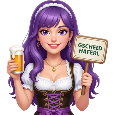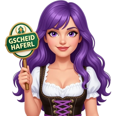 girl with long purple hair wearing a dirndl holding a GSCHEID HAFERL! sign emoji