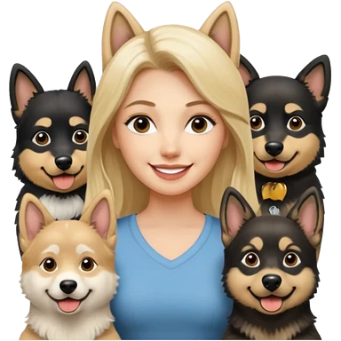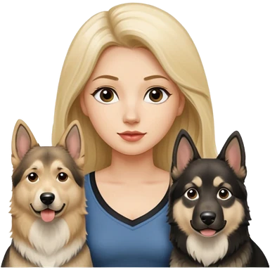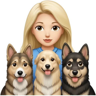 a lady, blonde long hair with 2 german shepards and one black and white alaskan malanute emoji