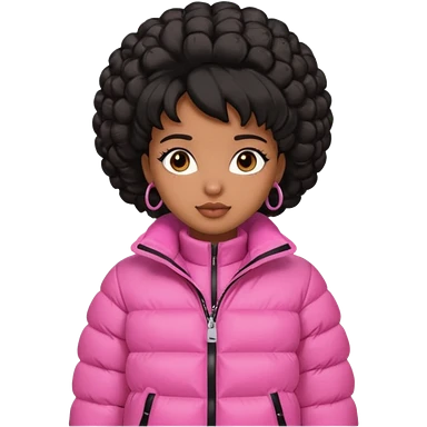 A brown skin skinned girl that’s has puffy black hair with her hair up in a puffy hairstyle and skinny and wears a pink puffer coat emoji