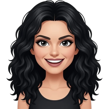 adult woman, wild long black curly hair, very pale skin, dark eye makeup, manic intense grin, slightly tilted head, head-and-shoulders portrait, centered, 3D glossy emoji style, clean background emoji