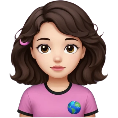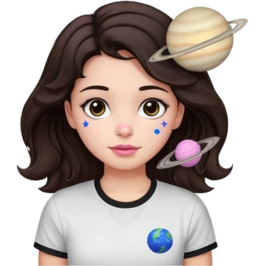 I want to design a girl with wavy hair that is dark brown, close to black And you wear a T-shirt Its color above the neck and sleeves is black The bottom is white, with a star and the planet Saturn on it Her eyes are also dark brown, and her cheeks are pink emoji