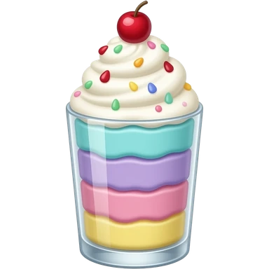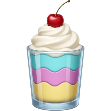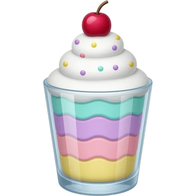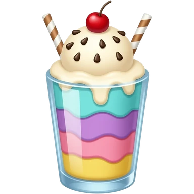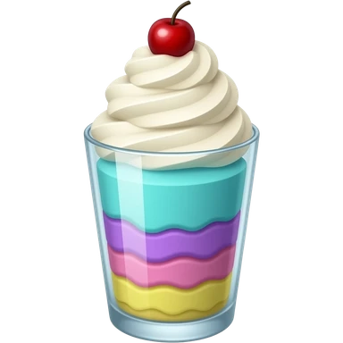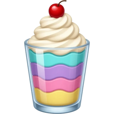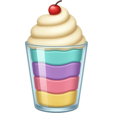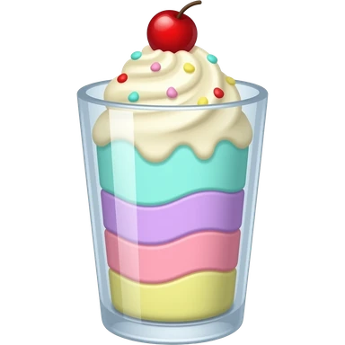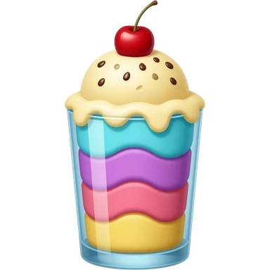 sundae dans un verre transparent, multicolore pastel, couleurs turquoise mauve rose jaune, pas de cerise, étagé emoji