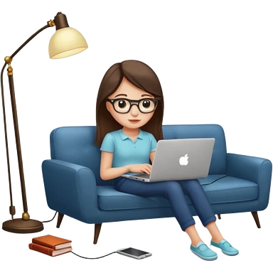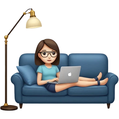 A girl is working with a laptop while lying on a sofa, with a floor lamp to the right. emoji