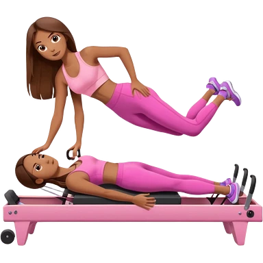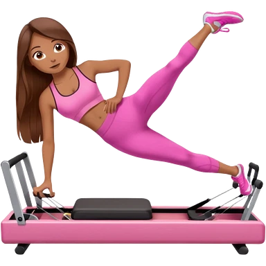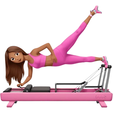 girl doing a plank on a pilates reformer in a pink workout set with long brown hair emoji