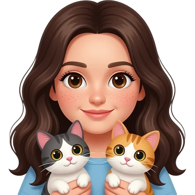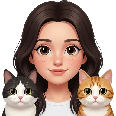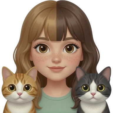 girl with dark brown eyes, a lot of freckles,pale skin, long full lashes and long half light brown and half dark hair no bangs with two cats emoji