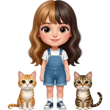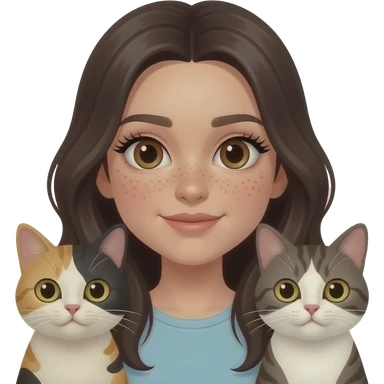 girl with dark brown eyes, a lot of freckles,pale skin, long full lashes and long half light brown and half dark hairwith two cats emoji
