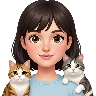 girl with brown eyes, a lot of freckles,pale skin, long full lashes and dark hair with two cats emoji