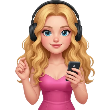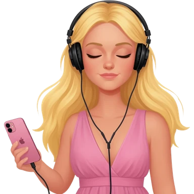 girl blonde long hair in pink dress listen to music rock and roll on black headphones on head connect to pink iphone max pro and hold on headphones on head with right hand emoji