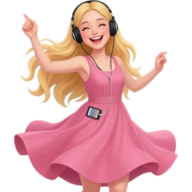 girl blonde long hair in pink dress listen to music rock and roll on black headphones with mp3 player and hold on headphones on head with right hand emoji