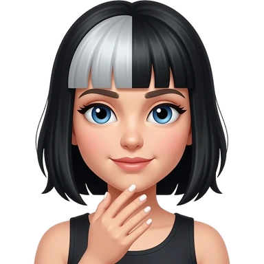 Girl with black hair, a platinium under and blue eyes looking at her nails emoji