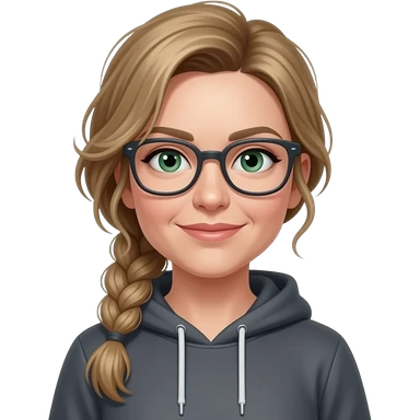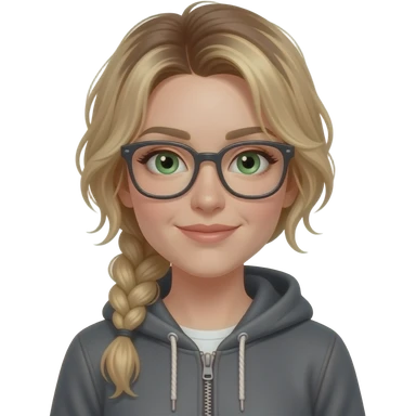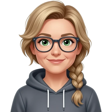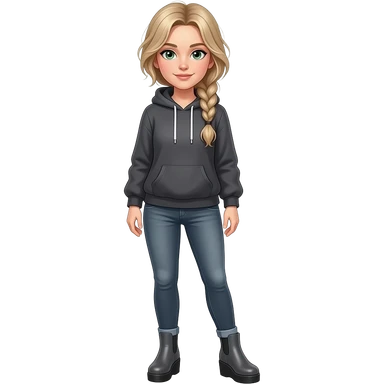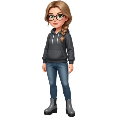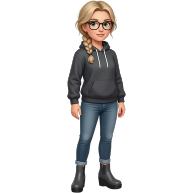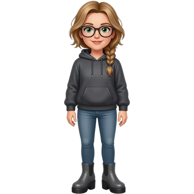 girl in her 30s, dirty blonde/brown hair, side part, messy low side braid, green eyes with glasses dark grey hoodie, gunmetal gray fitted jeans, charcoal platform wedge boot, standing emoji