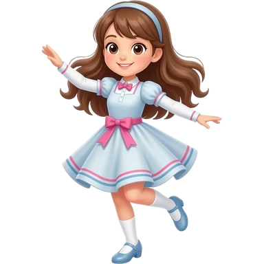 girl brown eyes, brown slightly curly very long hair with bangs, pale pink dress, white hair bows emoji