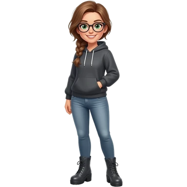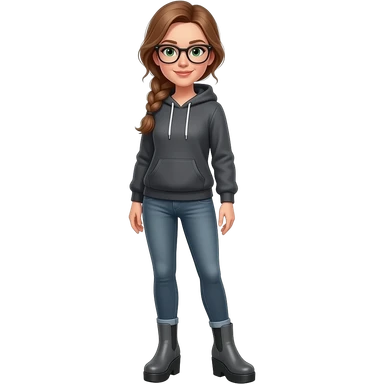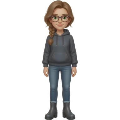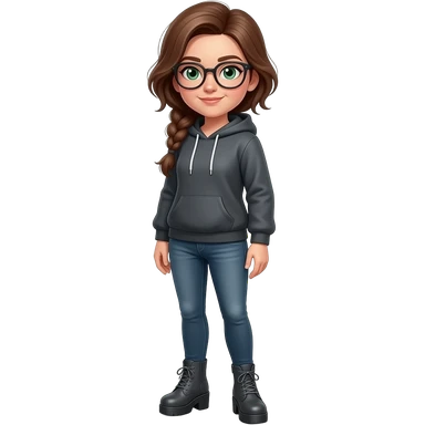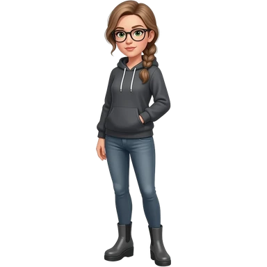 girl in 30s, light brown hair, side part, messy low side braid, green eyes with glasses dark grey hoodie, gunmetal gray fitted jeans, charcoal platform wedge boot, standing emoji