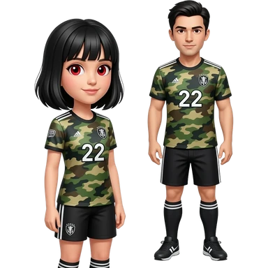 Girl with black hair red eyes and a camo soccer jersey standing with her back turned to a 22 year old with black hair who looks like her with red eyes wearing the same thing emoji