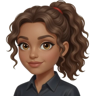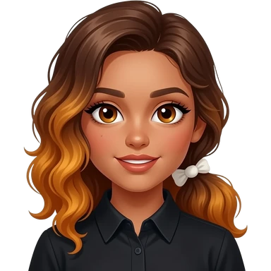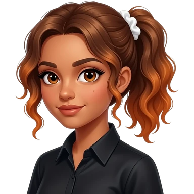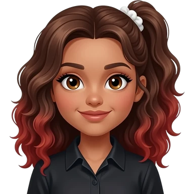 girl with medium to long, slightly curly brown, naturally very lightlyorange-tinted hair all gathered up in a single low ponytail held with a white scrunchie, dark-goldenish-brown skin, big brown eyes, long lashes, thick dark eyebrows, a single dimple on her left cheek, vampire shirt. emoji