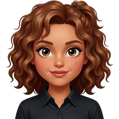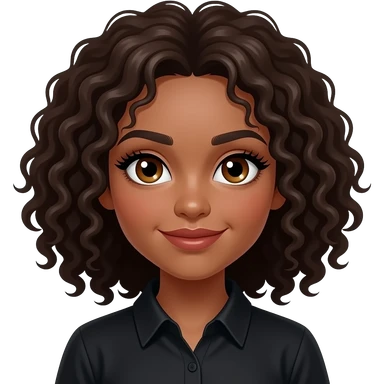 girl with dark, curly brown hair, dark-goldenish-brown skin, big brown eyes, long lashes, thick eyebrows, a single dimple on her left cheek, vampire shirt. emoji