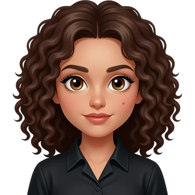 girl with dark, curly brown hair, light-goldenish-brown skin, big brown eyes, long lashes, thick eyebrows, a single dimple on her left cheek, vampire shirt. emoji