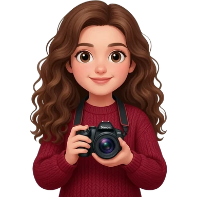 Girl brune bouclés long avec un pull rouge bordeaux avec un appareil photo en main Style IOS emoji