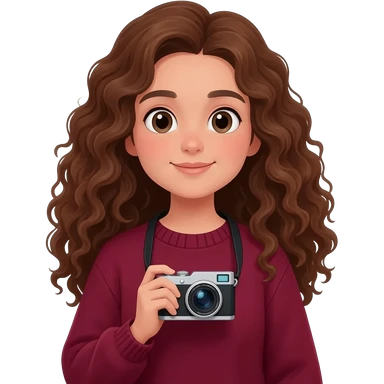 Girl brune bouclés long avec un pull rouge bordeaux avec un appareil photo en main emoji