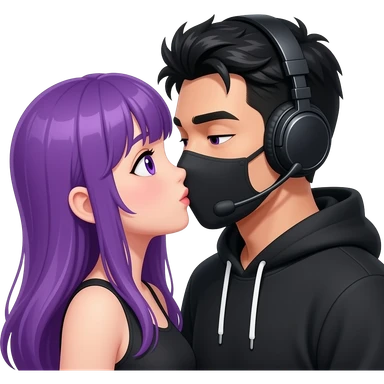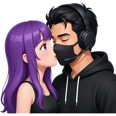 girl with long purple hair and purple is get kissed from an blackhaired attractive man in a black hoodie with a black mask and a headset emoji