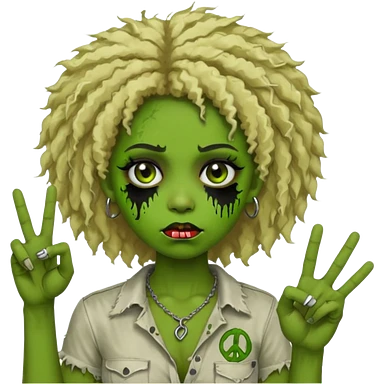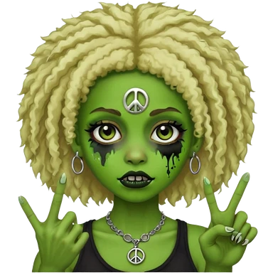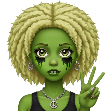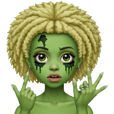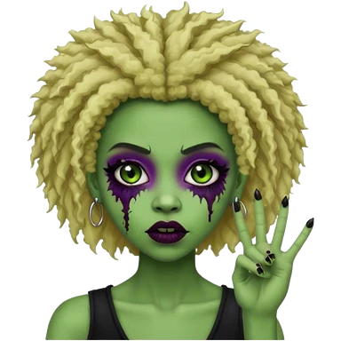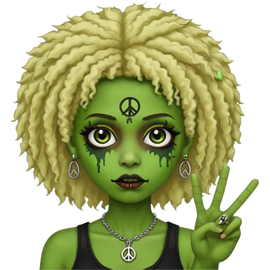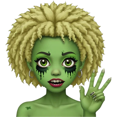 girl, green zombie,blonde afro, medium long, shaggy, dark, spooky,double eyebrow dermal piercing,peace sign emoji
