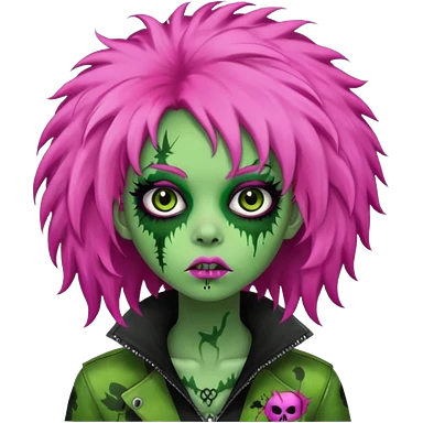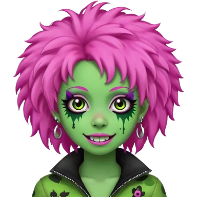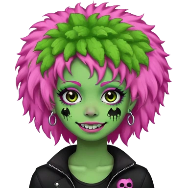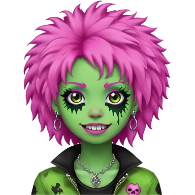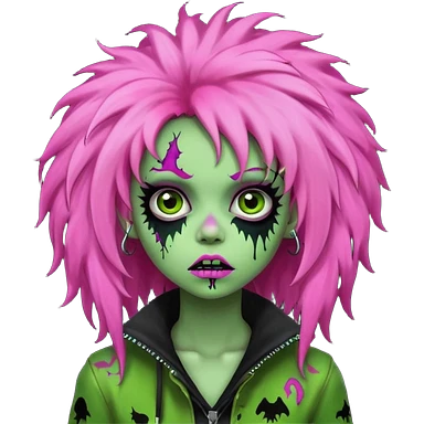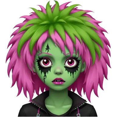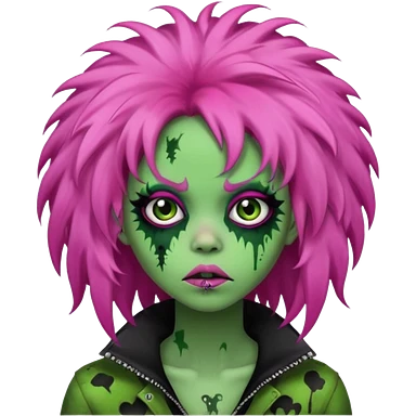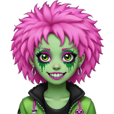 girl, green zombie,pink afro, long, emo, shaggy, dark, spooky,double eyebrow dermal piercing, cute illuminous smile emoji