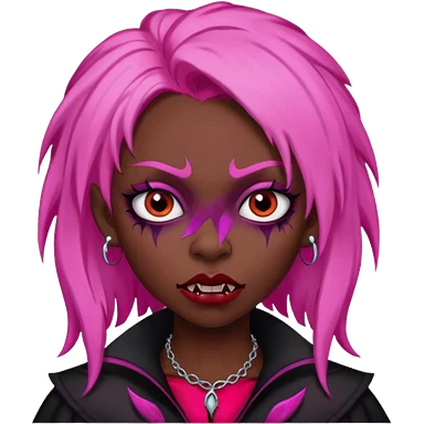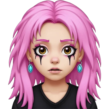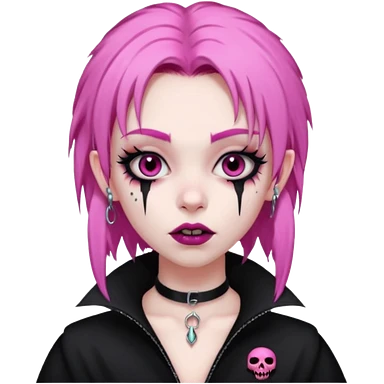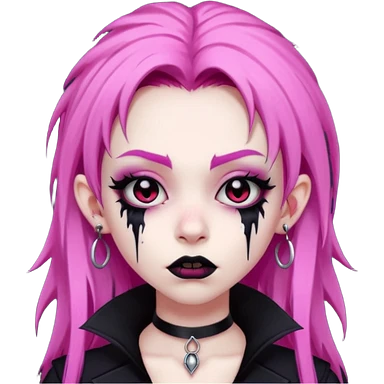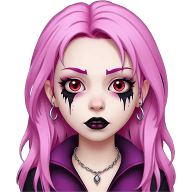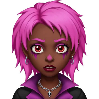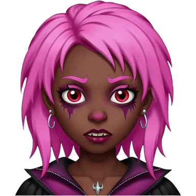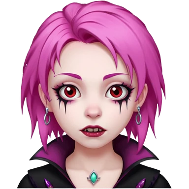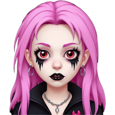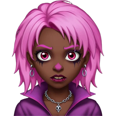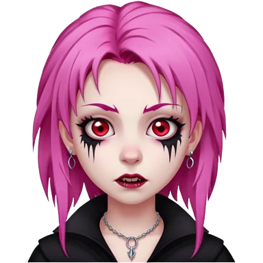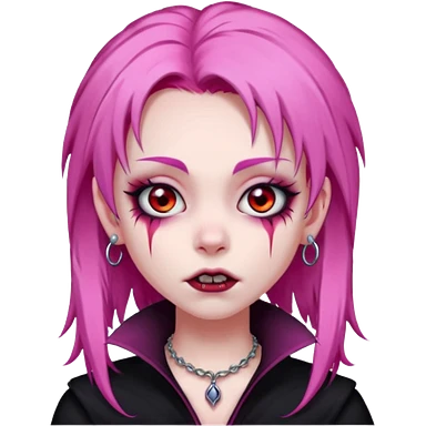 girl, pale black vampire, pink hair, very long, shaggy, dark, spooky,double eyebrow dermal piercing, creepy expression emoji